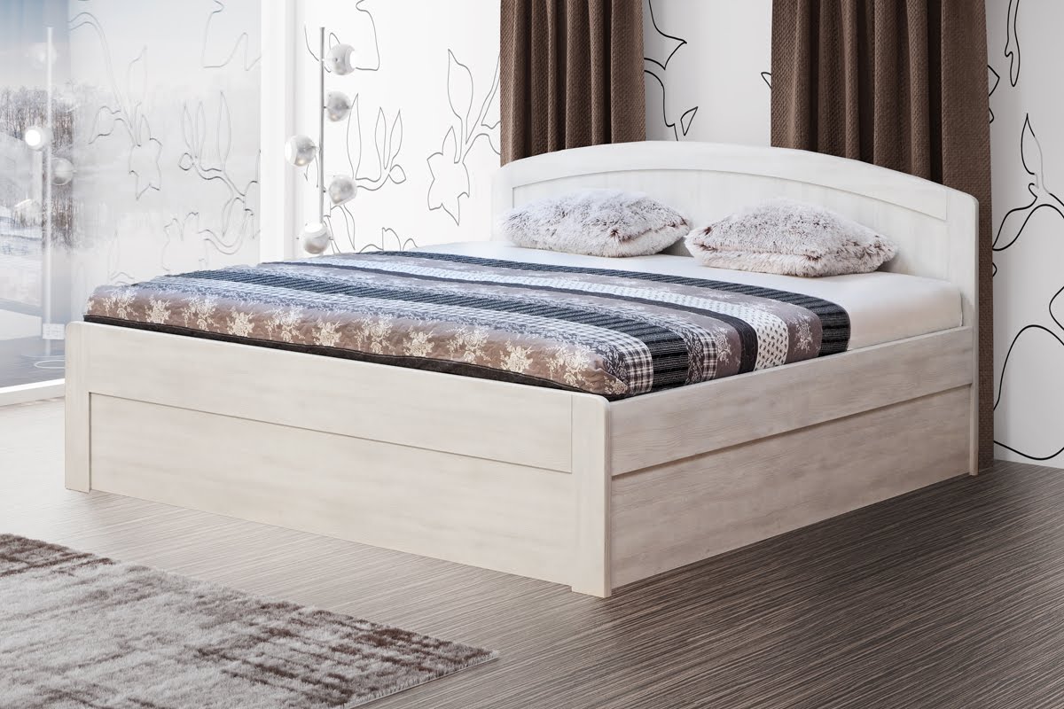 Praktická postel s moderním designem a úložným prostorem. Vyrábí se v provedení masiv buk i dub s velkým výběrem moření a olejování dřeva. Další možností je vyrobení postele v imitaci masivního dřeva s velkým výběrem odstínů. Postel nabízíme v rozměrech 90,120,140,160,180,200 x 200 cm, ale i v prodloužených délkách 210,220 cm. Postel můžete doplnit nočními stolky.